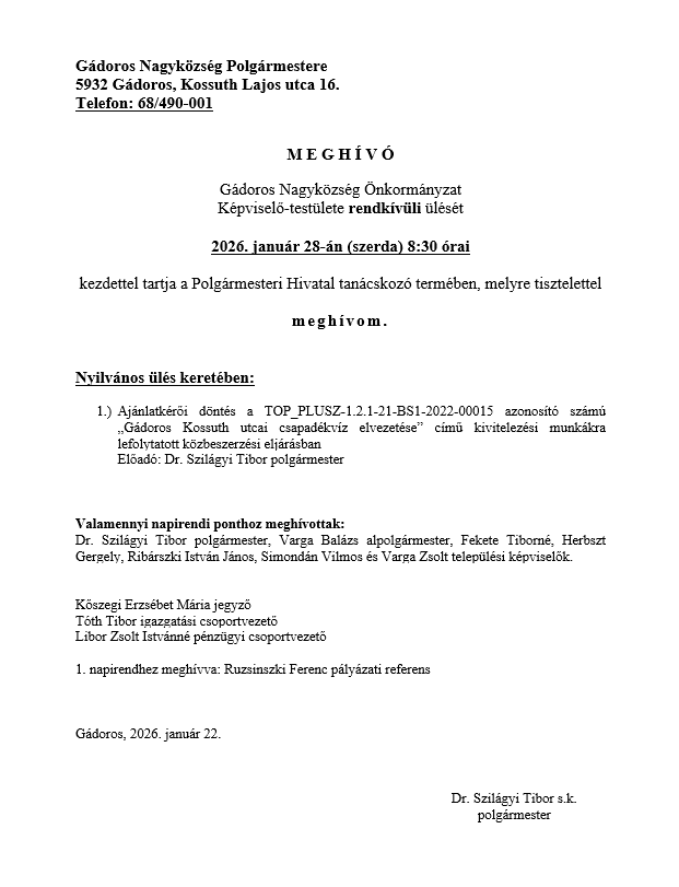 • „Gádoros Nagyközség Kossuth utcai csapadékvíz elvezetése és közösségi célú fejlesztése” TOP_PLUSZ-1.2.1-21-BS1-2022-00015
